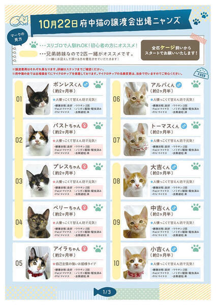 | 里親募集する理由 | 個人、自治会、商店街、市役所から依頼されTNRに入った現場でrescueした猫の内、子猫ちゃんを中心に里親様を募集しています。 ※活動内容や、里親さまからの心温まるお便りを載せているので、当会のBlogも是非ごらんください。 https://chuneko.exblog.jp/ ※ⅹ(旧Twitter)、FaceBook、Instagram、YouTube始めました[NPO法人 府中猫の会]で検索! |