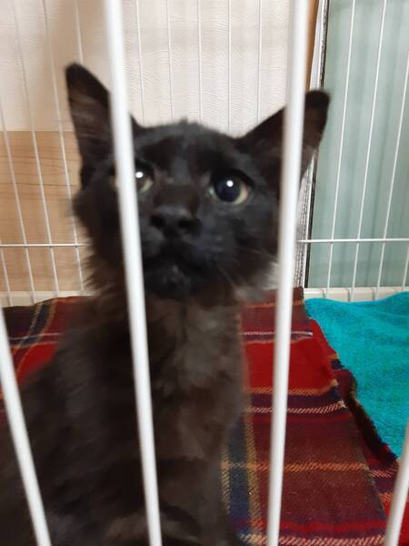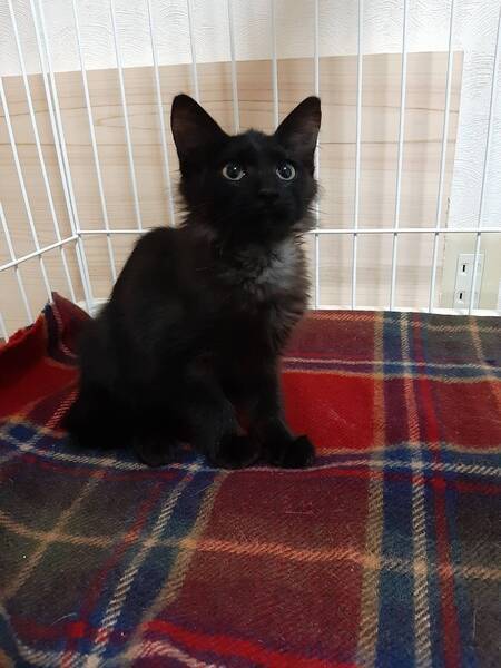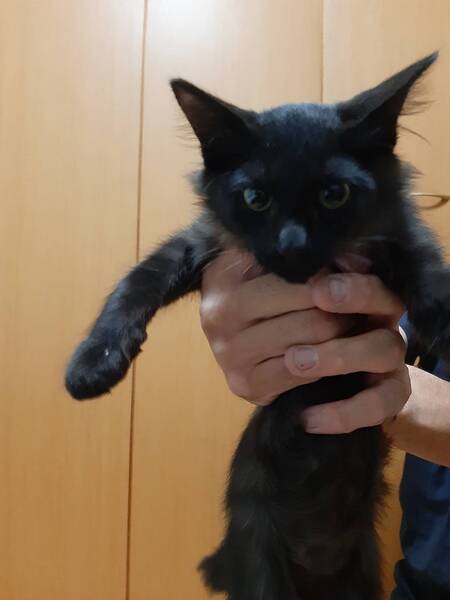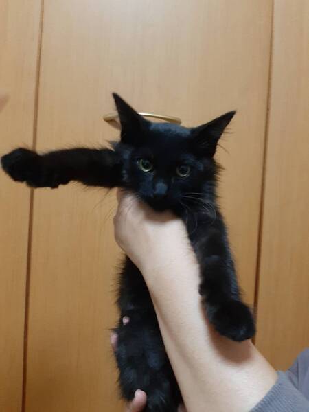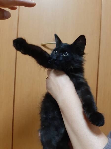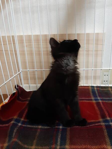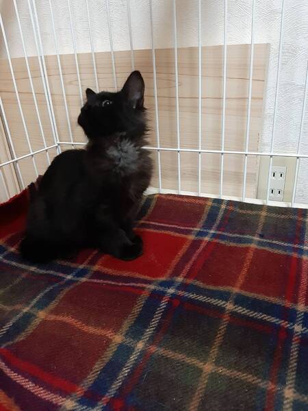 | 特徴(性格など) | 色柄:黒をベースに(半分長毛?)で胸元に優雅なマフラー柄があるのでとても洋風エレガント猫になると思います。お腹は黒とグレイの縞模様でとてもとても可愛いです。 性格:人が大好き抱っこ好きです。警戒心とは無縁で、初対面から抱っこされるがまま、ゴロゴロが止まりませんでした。無駄泣きもなく、とてもいい子です。行動は甘えん坊で食欲抜群、活発、元気そのものです。 |