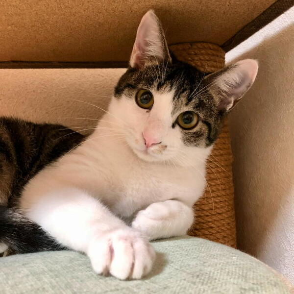 | 特徴(性格など) | サバ白♀/保護時体重1.74kg→2.43kg(11/16現在)/ビビりで臆病、何事にも慎重です/人慣れ訓練中(触れるようになりました) | ||
