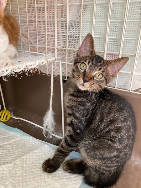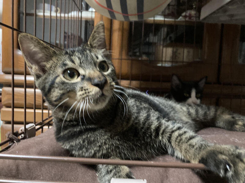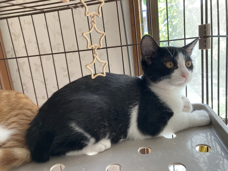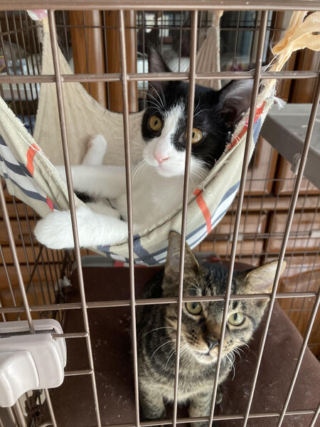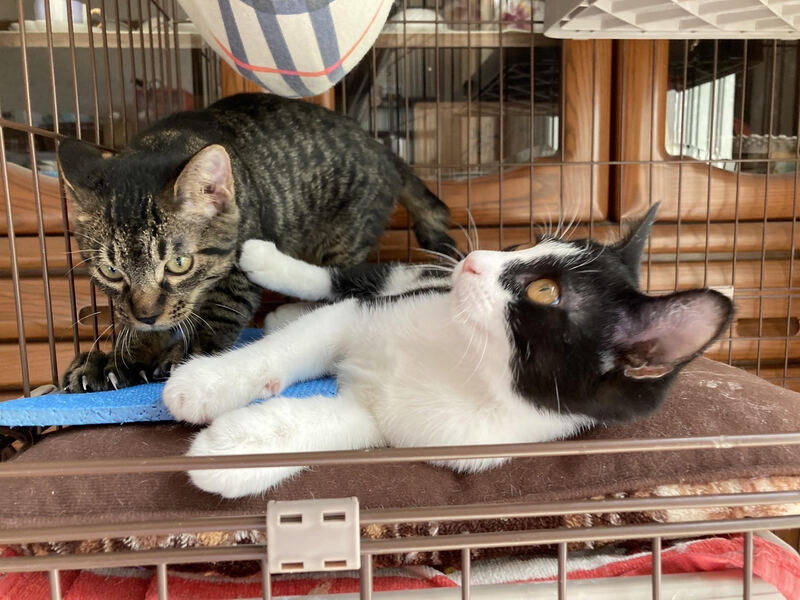 | 特徴(性格など) | 兄:黒キジトラ 元気でおもちゃを見つけると飛んできていつまでも遊んでいます。ものおじせず人懐っこい性格です。家族以外にもすぐ慣れて甘え、抱っこも喜んでくれます。 弟:白黒ハチワレ 兄とは正反対で、大人しく慎重な性格です。あまり大声で鳴くこともなくおもちゃでも静かに遊んでいます。家族にはおなかを見せてゴロゴロ喉を鳴らしますが、最初は緊張のため警戒するかもしれません。 |
