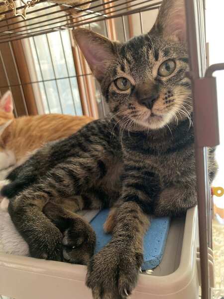 | 里親募集する理由 | 野良猫として兄弟で近所をウロウロしていたため、保護団体の指示で保護しました。 飼い主がいないことは保護団体と確認済です。 先住猫がいるため残念ながら我が家ではこれ以上飼うことができません。 保護以降は人間にも慣れ、よく食べよく遊びよく寝ています。 三種ワクチン2回接種済み、猫エイズおよび白血病ともに陰性です。 ノミダニなど駆除済です。 |