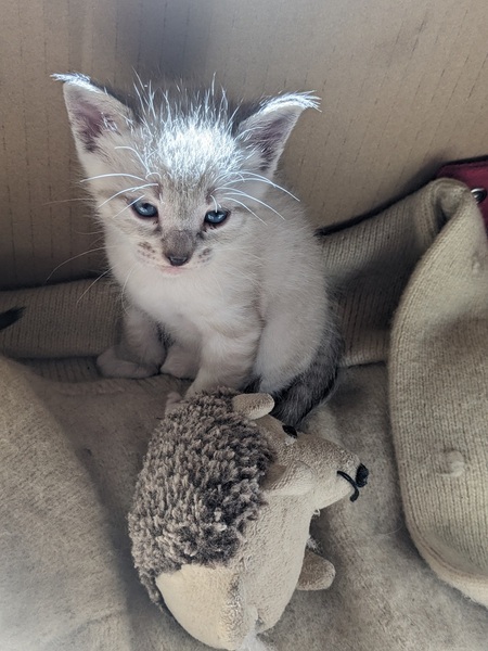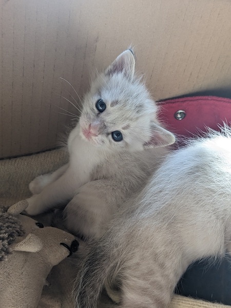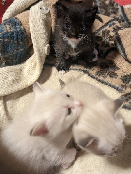 | 特徴(性格など) | 黒に白が混じった子がメスで白に近いグレーの子たちはオスです。 生まれた日から世話をしているので人慣れしています。とても大人しいです。 白い子の1匹が足の指がありません。うちの猫が舐め過ぎて指が取れてしまったと思われます。特に歩行に支障もなく元気です。 |