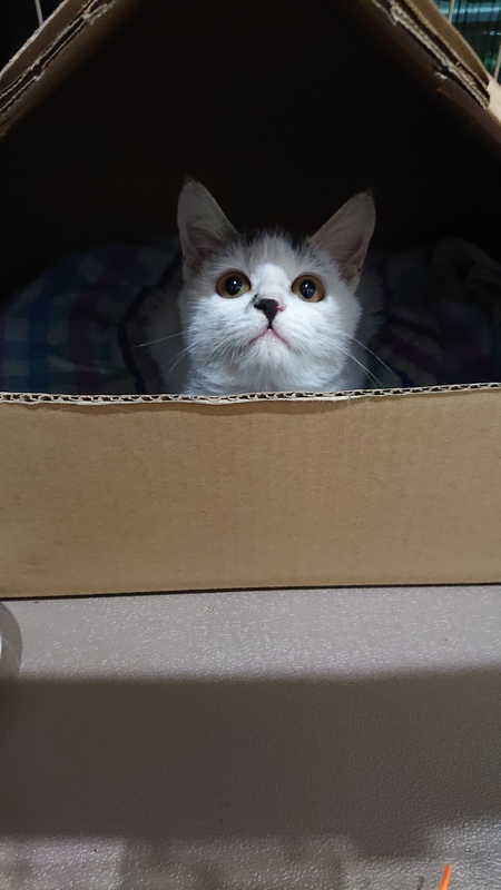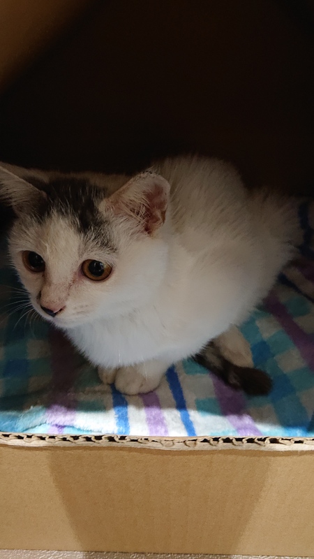 | 特徴(性格など) | 白い体毛に、尻尾と額にサバトラ柄の毛が生えています。 体型は生後1ヶ月程度の子猫サイズです。 性格は、寂しがり屋で、まだ慣れていないせいか臆病です。 トイレは設置場所でします。 食欲旺盛です。 |