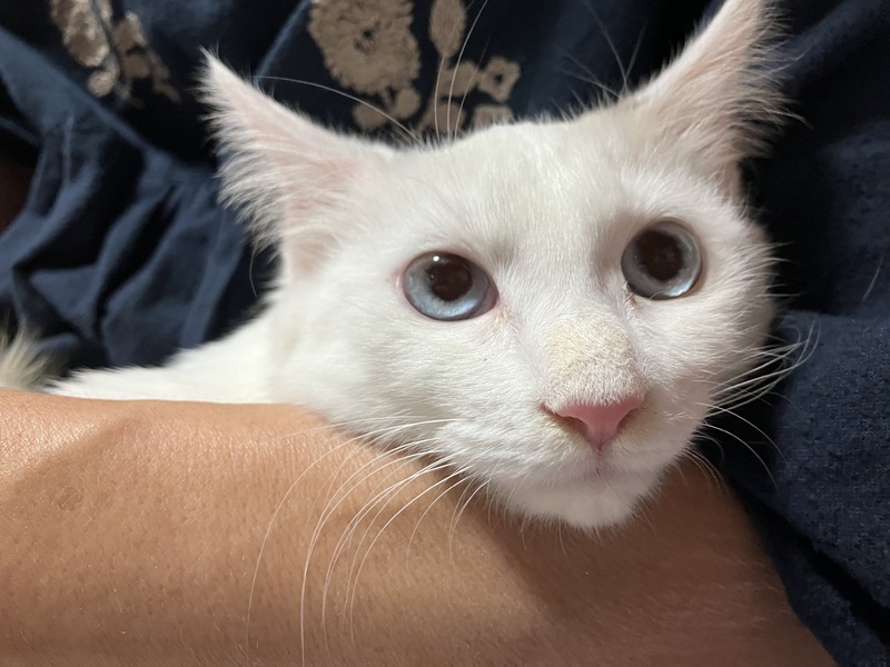 | 里親募集する理由 | 先月(2023年9月)車に乗っているとき、道路で、怪我をした痩せた子猫に出会いました。 その場ですぐに保護できなかったのですが、どうにもこうにも気になってしまい、後でその場所に行ったところ、 ごはんをあげてくれていた方が居てお話をうかがうと、 姉妹猫と母猫も居るとのことで、 一家丸々保護して、ずっとのおうちを探すことになりました。 この白猫は、怪我をしていた子の姉妹猫です。 夏の暑い時期、母猫は痩せた体で子猫にお乳をあげ、虫を取っては自分では食べずに子猫にあげるのを見て、ごはんをあげるようになったそうです。 ちなみに虫下しは済んでいます。 怪我をしていた子はトライアルが決まり、現在この白猫と母猫のずっとのおうちを探しています。 よろしくお願いいたします。 |