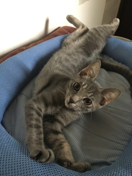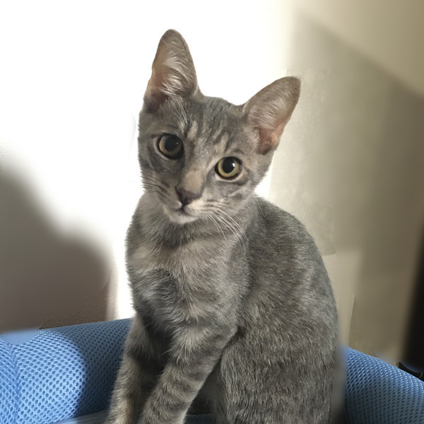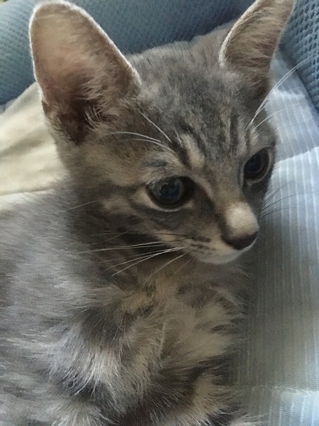 | 特徴(性格など) | ●色柄● サバトラに似ていますが、ロシアンブルーのようなグレーにトラ柄の珍しい柄です。 ●性格● 母猫とはぐれたのか、1匹でいたところを600gという幼猫期に保護したので、人も大好き猫も大好きおやつも大好きな子です。 避妊済みの先輩猫にチュパチュパするのが大好きなまだまだ甘えたい盛りの可愛い子です。 |