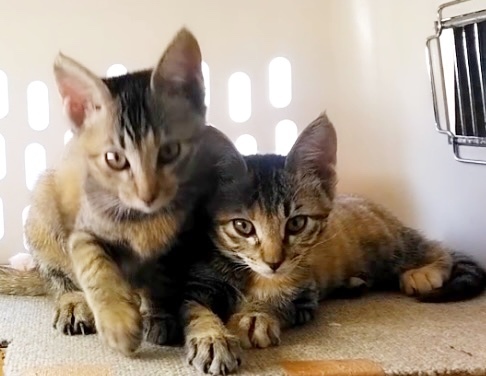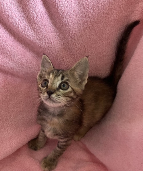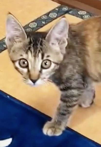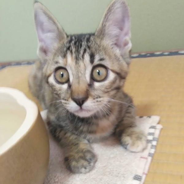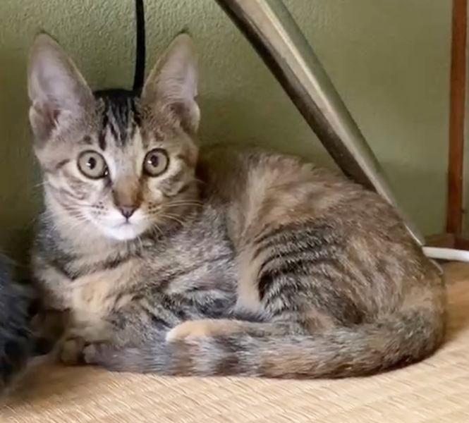| その他(譲渡条件など) | ✳︎特徴 お顔と手足はキレイなタビー柄(シマ模様)が出ていますが、背中部分はタビーとサビ柄が混ざったような変わった毛色です。あまり見かけない珍しい毛色です。尻尾は真っ直ぐです。この毛色は、三毛さんと同じくほぼ女の子です。まろっぽい眉がかわいくて個人的にチャームポイントです。 ✳︎性格 どちらかといえば、兄弟より姉妹のほうがやんちゃで元気に遊んでいます。転げ回ってる動画がありました!撮影時、トイレをしているときにあまり砂をこぼさないで用を足していたのがとても印象的だったと撮影に立ち会ったボラさんが仰っていました。これはかなりポイント高いですー!と(笑)。オトナになったら、もしかしたら盛大に砂かきをするかもしれませんが、ご了承ください。←砂かきするのがフツウです。 これから4ヶ月くらいまでの間は、子猫さんの社会性が育つ時期になります。取っ組み合いの喧嘩をしながら、甘噛みを覚えたり、追いかけっこしながら、動体視力を養っていきます。 兄妹のうち、メンズの2兄弟くんに面会が決まっており、仲良しの姉妹が待機をしています。できれば、姉妹で2頭一緒に迎えてくださるお宅を優先させていただきたいと考えております。 |