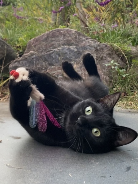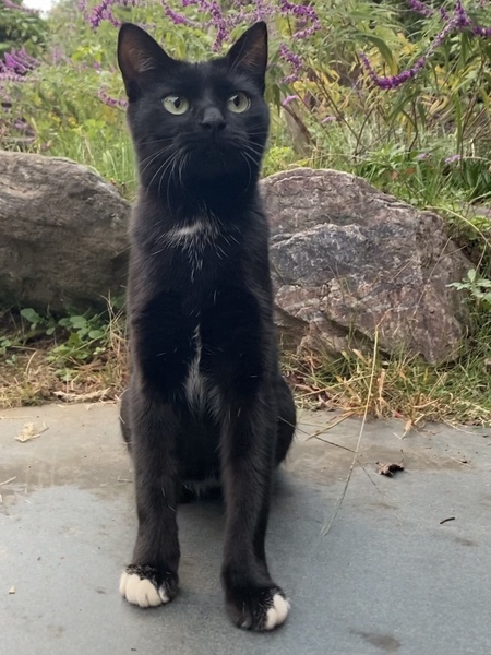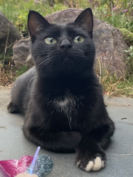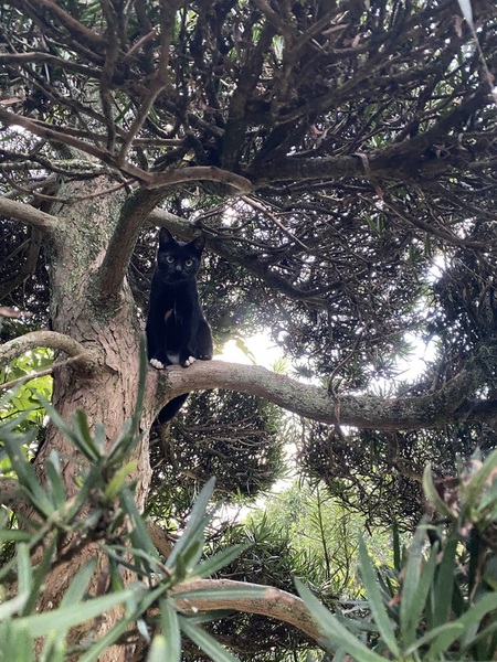 | 特徴(性格など) | つま先と胸とお腹に白い毛がある黒白猫です。 小顔でスリムな体型です。 じゃらし遊びや木登りが好きです。 |