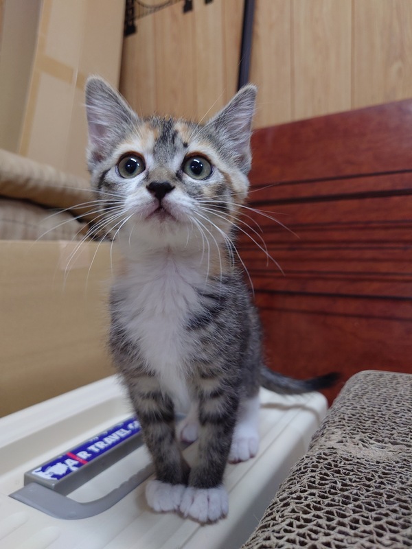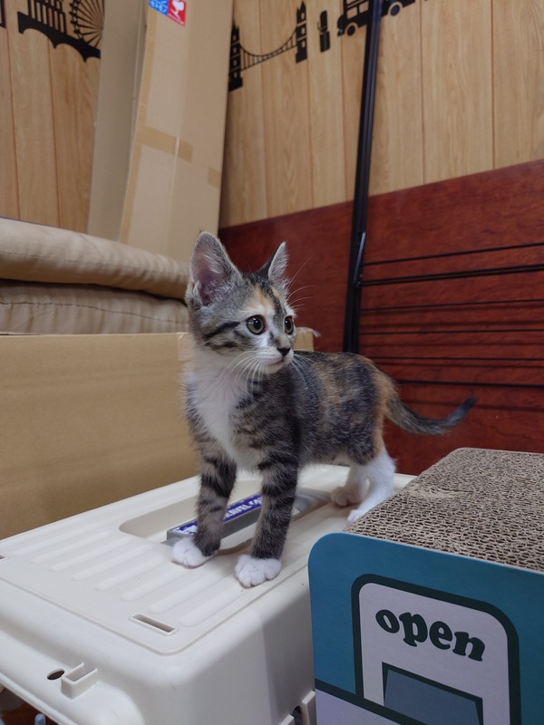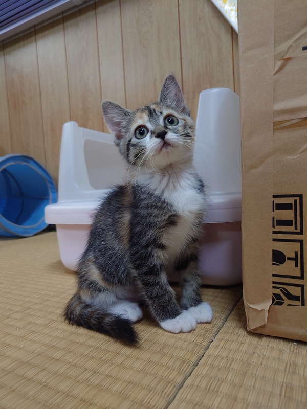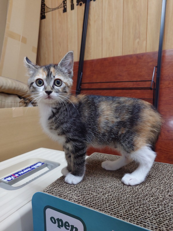 | 特徴(性格など) | 綺麗な三毛柄で、尻尾が長くまっすぐ、お手々は白いです。 甘えん坊で人懐っこい性格です。 ドライフード、ウェットフードどちらもよく食べます。 トイレもうんちを踏んだりすることもなく上手にできます。 |