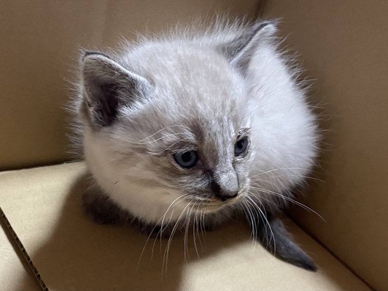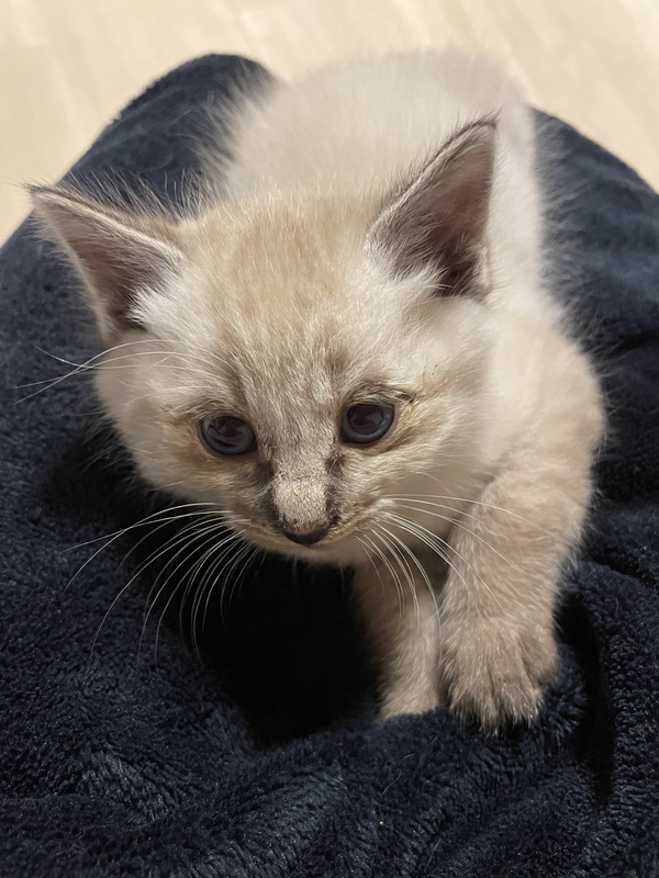 | 特徴(性格など) | シャムの様なグレーと白の薄い縞模様が入っています。 とても元気で良く動き回ります。 ご飯もお皿から食べられるようになってきました。食欲もしっかりあります。 トイレも失敗せず自分でできます。下痢などもしてません。 軽くネコ風邪を引いていて目やにがでるので、目薬を動物病院から処方していただき、現在刺していて、だいぶ良くなってきました。 ノミダニ予防を動物病院でしてもらいました。 推定1ヶ月ちょっとの子のようです。 おしゃべりさんで歩くと後ろをついて来たりしてとても懐っこいです。 呼ぶと走って来ます。 撫でたり抱っこするとゴロゴロ言います。 |