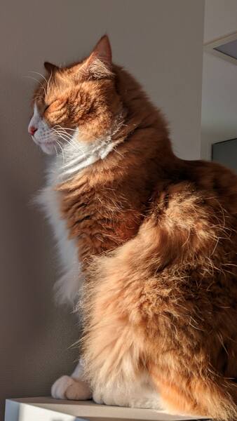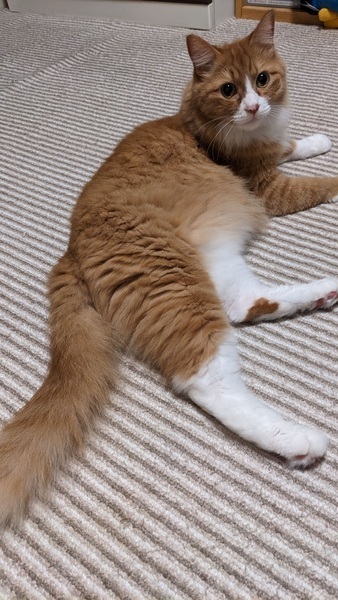 | 特徴(性格など) | 臆病で慎重な性格の子なので先住猫ちゃんがいない方でよろしくお願いします。 抱っこは苦手ですが夜は近くで布団の中に入ってきてくれます。甘えるのがそんなに得意じゃない方だと思います。とても健康です。 大柄で5キロあり毛質は柔らかく抜けにくいです。 エイズ白血病陰性です。 |