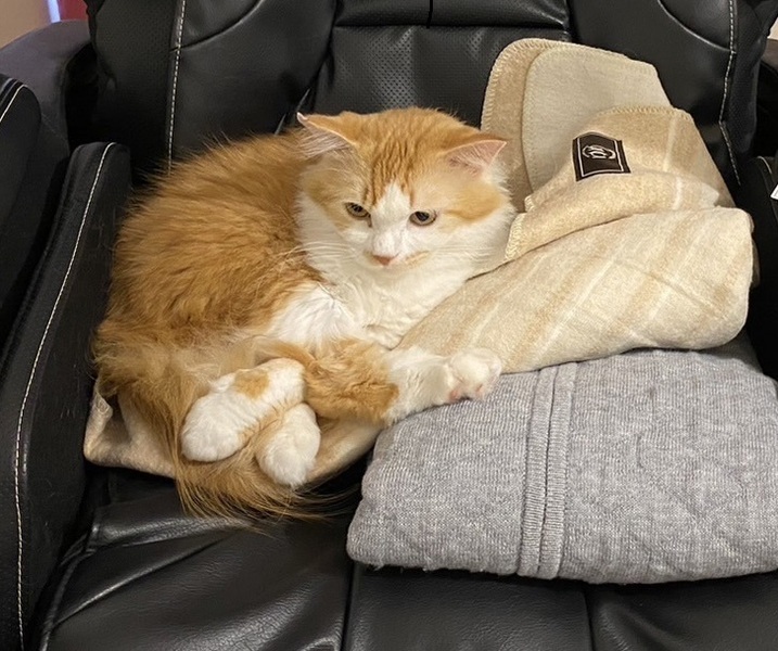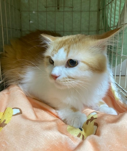 | 特徴(性格など) | 茶白で半長毛でしっぽがフサフサしていて、綺麗な猫です。 少し臆病な性格ですが、人にもだいぶ慣れてきました。 食欲もあり、健康状態は良好です。 |