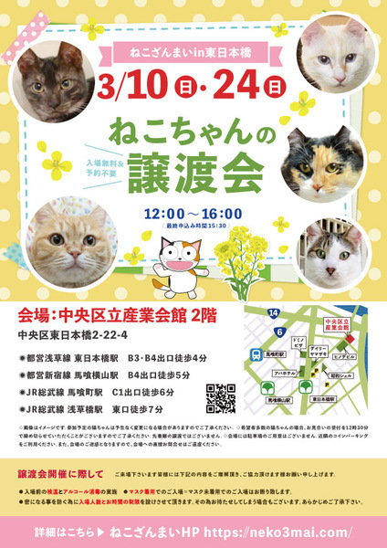 | その他(譲渡条件など) | 11:30より、2階会場入口にて受付を開始します。 受付時に入場予定時間が記入された整理券をお配り致しますので、整理券を受け取った方はお時間になりましたら2階会場入口に番号順にお並び下さい。 ※11:30より早くいらしてもお待ちいただく場所がございません。 また、近隣にお住まいの方や他階フロアのご利用者様にご迷惑となる場合がございますので、受付開始時間にあわせてお越しくださいますよう、何卒ご協力お願いいたします。 ※ねこざんまい譲渡会は、先着順で里親様を決定する譲渡会ではありません。 先に申し込みをした方を優先することもありません。 お話をして、その猫ちゃんに合ったおうちに決めさせていただいております。 12時に開場し、里親様の決定は14時以降となります。 14時以降にご入場の場合、希望の猫ちゃんが決定している可能性があります。 また1頭に対し多数のご希望をいただいた場合、早めに申し込みを締め切らせていただく場合がございますので、予めご了承下さい。 里親様決定は14時以降となります。 その後、迎え入れ準備の説明等のお時間も頂戴しますので、お時間に余裕を持ってご来場下さい。 ~~~~~~~~~~~~~~~~~~~~~~~~~~~~~~ ★仔猫ご希望の里親様★ 仔猫ちゃんたちは、まだ体がしっかりしていない赤ちゃんです。 下痢だけでも数時間対応ができなかっただけ死に至る事もあります。 その為、月齢に応じたお留守番時間を設けさせていただいております。 また、子猫ちゃん(6ヶ月未満)の里親様には子猫支援金のご協力をお願い致しております。 ★猫ちゃんとのお見合いは譲渡会で!★ ねこざんまいの猫ちゃんは譲渡会でのお見合いのみとなります。 『この子はいつ譲渡会に参加するの?』『譲渡会場の場所はどこ?』などは、ねこざんまいホームページをご覧ください。 https://neko3mai.com/ ★楽しく猫ちゃんと触れ合って★ ねこざんまい譲渡会は、猫ちゃんも里親様も保護主も笑顔で過ごせる譲渡会を目指しています。 これから20年以上、楽しい時も、悲しい時もいつも傍にいてくれる大切な家族になる猫ちゃんです。 会場には沢山の猫ちゃんがいます。 1匹1匹、触れ合って猫ちゃんとお話してください。 『初めて猫ちゃんを家族に迎える方』 『先住猫ちゃんのお友達を迎える方』など トライアルの仕方や先住猫ちゃんと仲良くなるコツなど経験豊富な保護主やスタッフにお気軽にご相談ください! 猫を愛し、そして猫に愛されている猫好きスタッフと保護主がアドバイスさせていただきます。 ★里親希望のみなさまへ★ ペットではなく、家族一員としてたっぷり愛情を注いでくださるご家庭をお待ちしております。 恐れ入りますが ●学生の方 子猫・幼猫希望の60才以上の方のみのご家庭 ●脱走防止対策にご協力いただけない方 は原則譲渡を遠慮させていただいております。 ●一人暮らし・同棲(事実婚)の方 保護主の希望や猫の年齢・性格等により、ご希望に添えない場合もございます。 参加猫ちゃんは、それぞれ保護主(実際に猫ちゃんを自宅に入れ、保護をしている方)が異なります。 詳しい条件なども異なる場合がございますので、会場内で直接保護主とお話ください。 〖共通条件〗 1.終生飼育 2.完全室内飼い 3.脱走防止対策へのご協力 4.避妊去勢手術 5.契約書類へのサイン 6.定期報告 7.医療費等の負担 当日の猫ちゃんを連れて帰ることはできません。後日、保護主が里親様のご自宅までお届け致します。 その為、移動の際の猫ちゃんの負担を月齢などから考慮し、お届け地区を限定させて頂くこともございますのでご了承ください。 ご理解とご協力のほど宜しくお願い致します。 ☆よくある質問☆ ・譲渡の条件 ・ご負担頂く費用 ・譲渡会の場所等は ホームページに詳しく掲載させて頂いておりますのでご覧ください。 https://neko3mai.com/ メールでのお問い合わせはすぐにご返答出来ない場合がございますのでご了承ください。 ホームページ https://neko3mai.com/ お問い合わせ http://www.neko3mai.com/contact/form_general.html ねこざんまいブログ http://ameblo.jp/neko3mai/ |