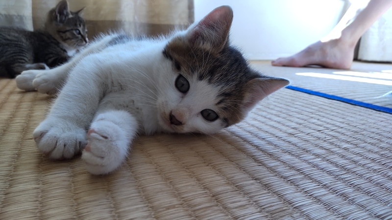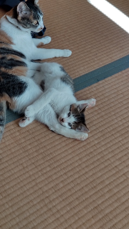 | 特徴(性格など) | ヤンチャですが、ビビリです。なので「ビビ(仮)」と呼んでいます。子猫2匹と母猫で元気に部屋を駆け回っています。 背中の真ん中の白い毛がチャームポイントです。 |
