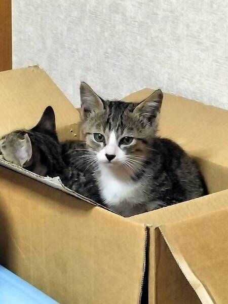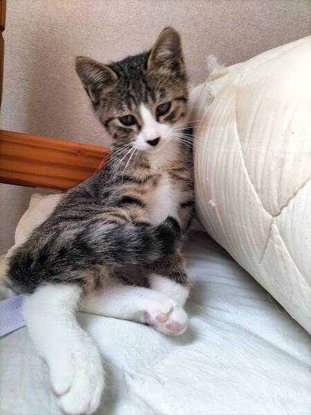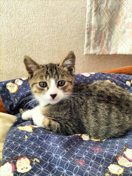 | 特徴(性格など) | そっくりなサバトラ3兄妹の1頭。一番の甘えん坊です。 兄妹たちと元気に走り回っています。 |