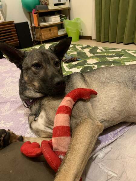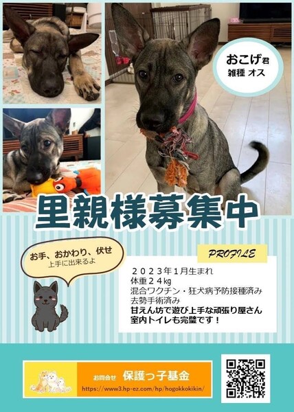 | 特徴(性格など) | かっこよく見えますが、実は初対面はビビりのかわいい男の子です。人間が大好きなので、すぐになじめると思います。トイレもばっちりです。現在は 室内で、他の犬とも仲良く生活しています。 | ||