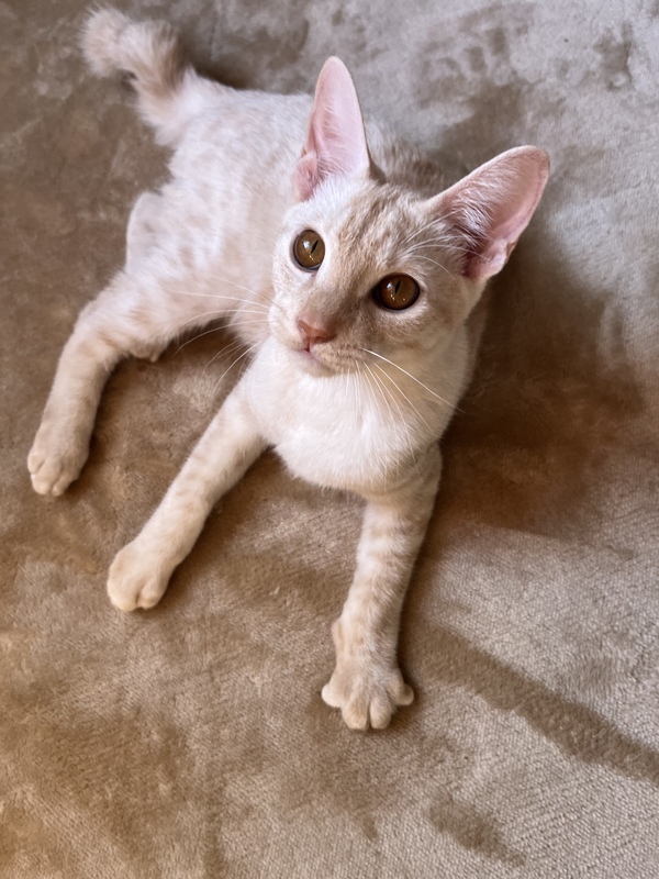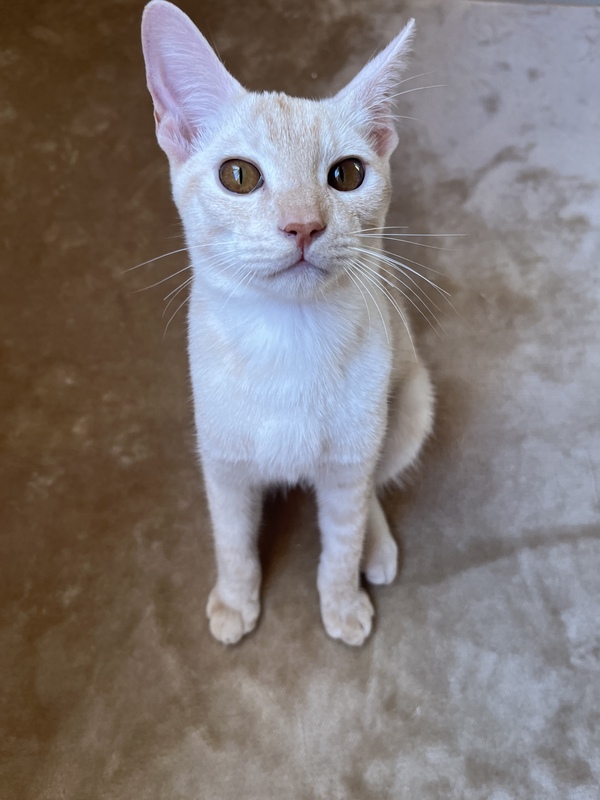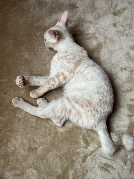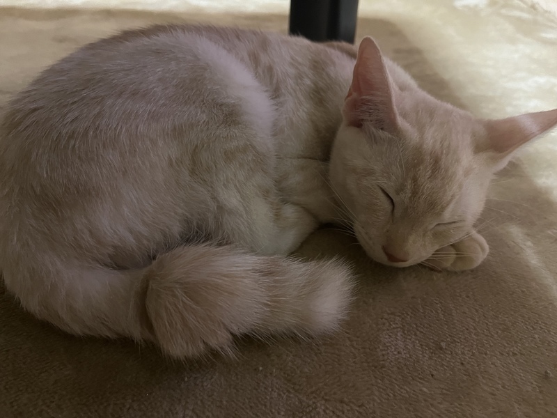 | 特徴(性格など) | 全体的にクリーム色をした男の子の猫ちゃんです。所々に茶色の毛が混ざっています。しっぽが特徴的で音符みたいな形になっている所がチャームポイントです! 性格はそこまでやんちゃな感じはないです。遊ぶことはもちろん大好きです! お顔は男の子らしさは抜群にありますが、甘えん坊さんです。ゴロゴロもいいますし1度甘えモードになるととことん甘えん坊な感じです!撫でられるのが結構好きな子です。 |