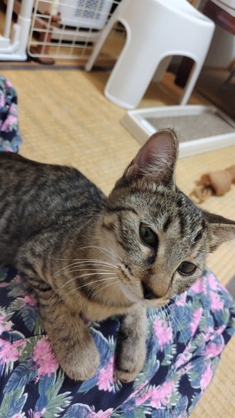 | 特徴(性格など) | 甘えたキジ猫さんです。 保護した頃は控えめな子でしたが 最近は男の子らしく真っ直ぐ甘えてきます 紐のおもちゃで遊ぶのが好き、 ダイナミックにジャンプします。 ウィルス検査(エイズ・白血病)陰性 |
