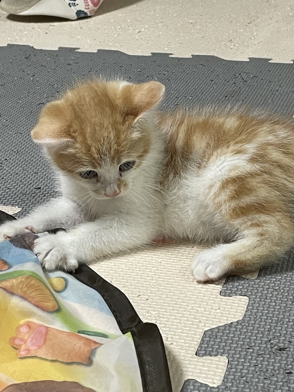 | 特徴(性格など) | アメリカンショートヘアの様な柄の茶白の子です。とっても可愛いです。 物おじしなくてめちゃめちゃ人懐っこい子です。 食欲旺盛で兄弟猫と走り回っています。 |