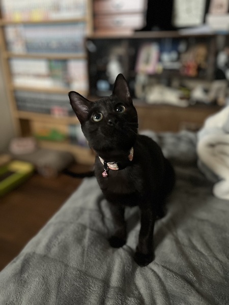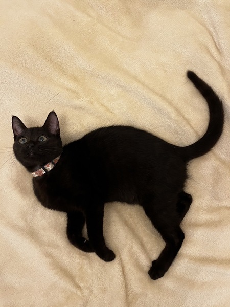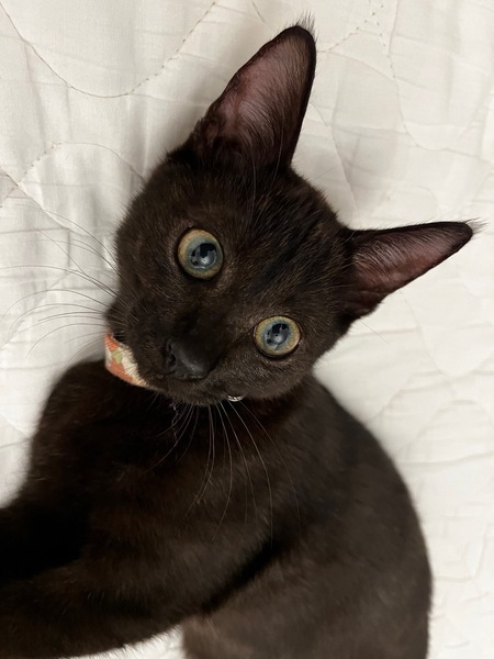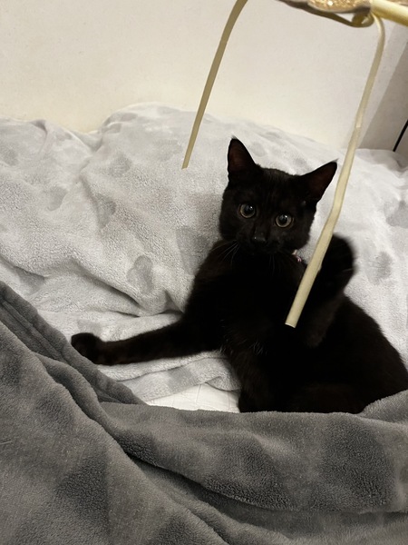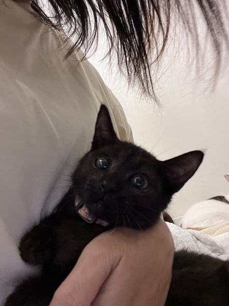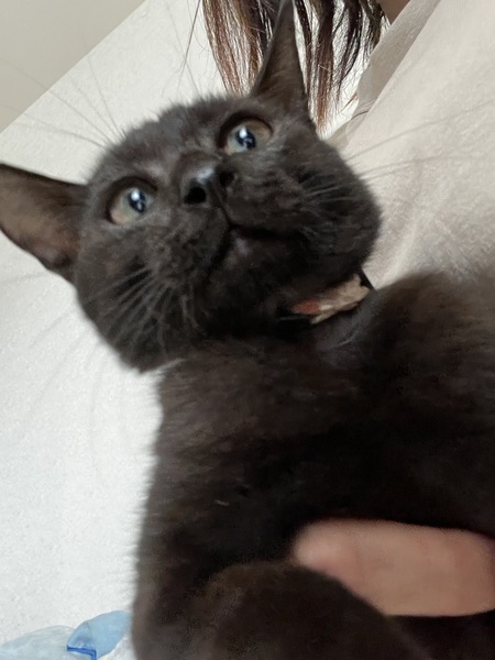 | 特徴(性格など) | 黒猫、短毛、長尻尾 小柄。 甘えん坊の可愛い女の子です。 猫も人間も大好きな子です。 ◆健康状態 ?ベガちゃん ?黒猫 女の子 ? 4か月くらい ?エイズ白血病陰性 ?検便済 ?駆虫済 ?ワクチン接種済2回 |