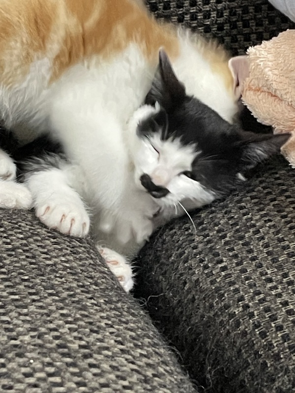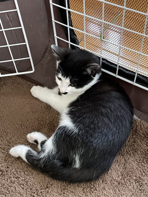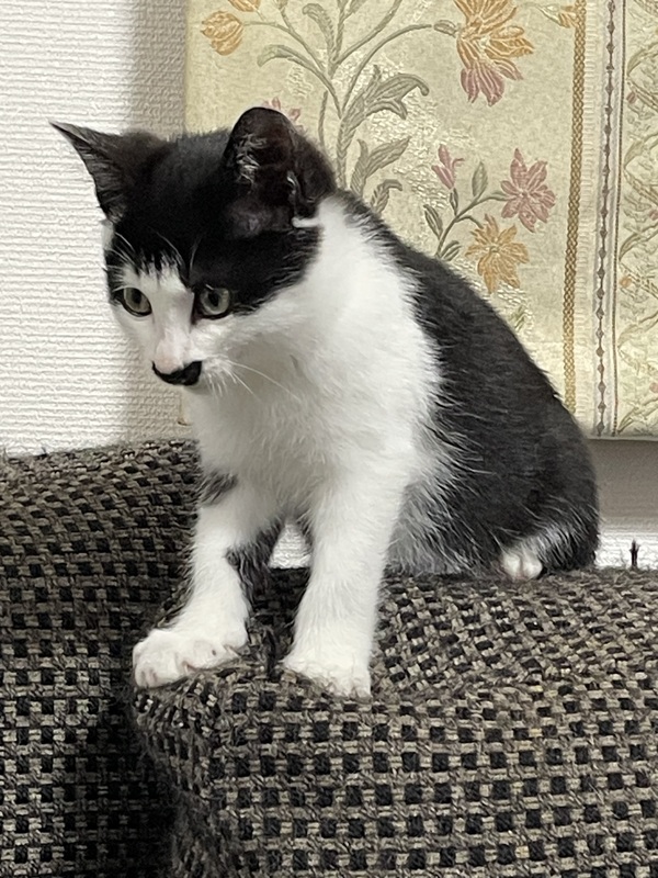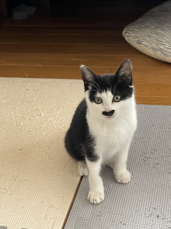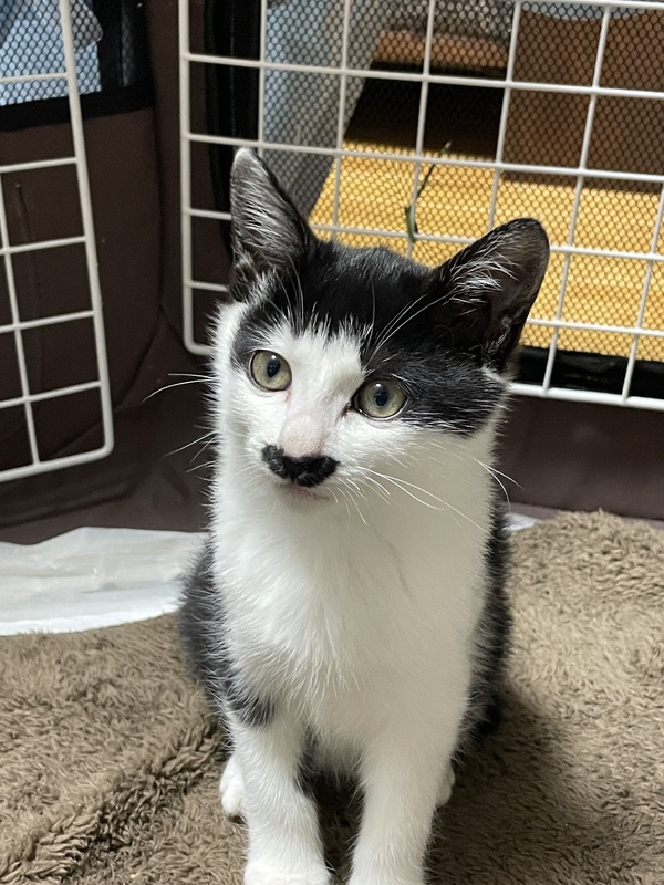 | 特徴(性格など) | 白黒の柄で鼻の下にはちょびひげのような模様がありとても愛らしいです。 少し警戒心はありますが抱っこは出来ます。控えめで慎重な性格です。 食欲旺盛で元気いっぱいで兄弟猫と走り回っています。 |