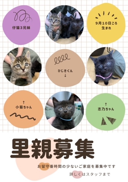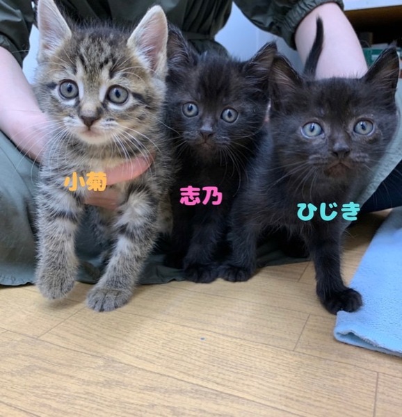 | 里親募集する理由 | ご近所で野良猫から生まれ、母猫からはぐれてしまった3兄妹です。 新しいお家探しをするため保護しました。 |