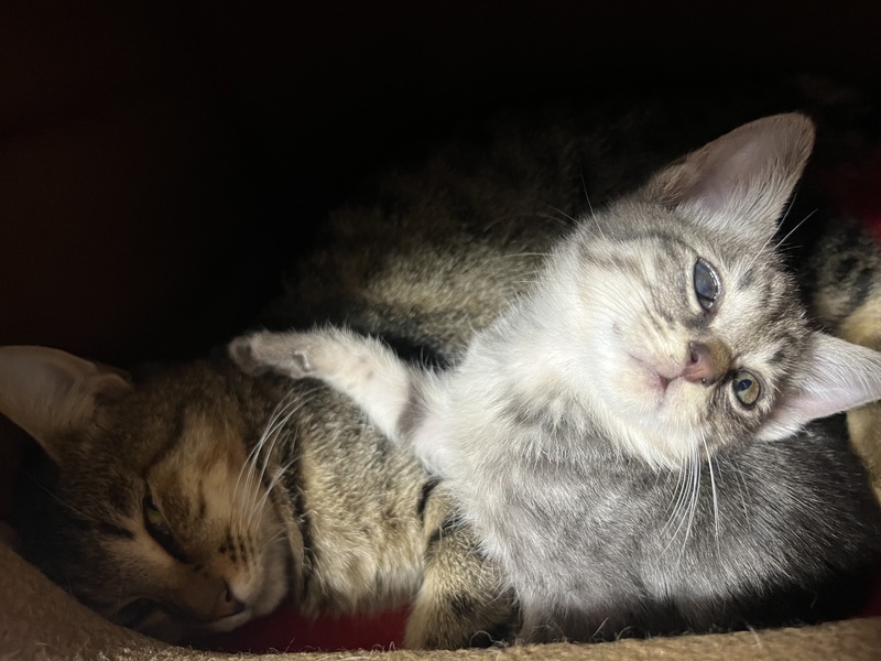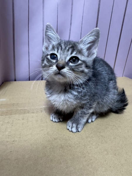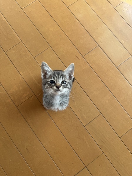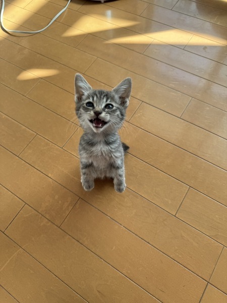 | 特徴(性格など) | サバトラの女の子です( ´ー`) 普段は大人しい性格ですが、おもちゃを出すと走り回ってかわいいです。 人慣れしていて、膝の上にのってきます。指や足をよくなめてきます。 生まれつき片目に傷が入っていて、少し白くにごったようになっています。病院で目薬を処方してもらっています。 生まれつき尻尾が短いです。 |