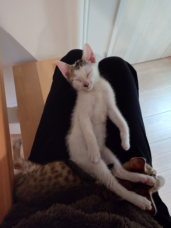 | 特徴(性格など) | 白地におかっぱ前髪柄で背中に4つブチ柄があります(おそらく男の子)、キジ白で脇腹にベンガル風な柄があります(おそらく女の子) 2匹とも人懐っこくて膝の上で眠ったりします。 2匹でじゃれ合って遊んでます。 |