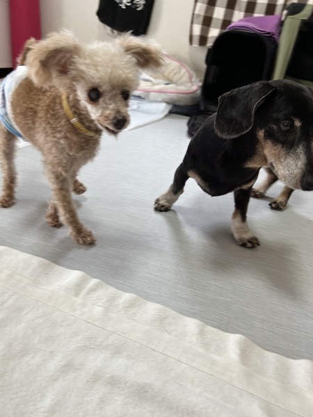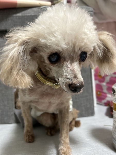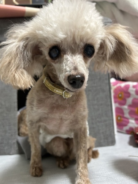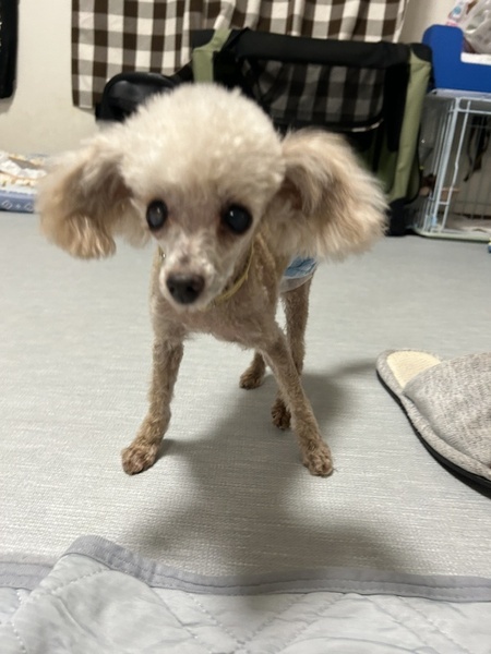 | 特徴(性格など) | 名前:ヌガー 犬種:トイプードル 性別:オス♂ 毛色:アプリコット 年齢:10歳くらい 体重:1.8kgくらい 性格:とてもおっとりゆったり過ごしているおじいちゃんです。 寝てる事もありますが、ウロウロする時はテケテケ歩いて元気です。 ご飯は食べる時と後に残しとく時のムラがあります。 すぐに食べない時でも、夜寝る時にご飯置いといたら、朝になるとほぼ完食したりしてます。 散歩はゆっくり歩きます。 フラフラする事もあるので、ハーネスで支えたりしてます。 排泄は、外でもすることはありますが、基本的には家の中でしたいみたいです。 トイレシートの認識はあまりないです。 うんちは歩きながらしてしまうので、シートから出ちゃってます。 吠えることはないです。 チャイムにも他の犬にも吠えたりしないです。 ふわふわのベッドの上で寝たいタイプなので、サークルなどにもふわふわを入れといてあげてください。 そうしないと、サークルをほりほりしてしまいます。 10歳くらいなので、先は長くはないかもしれないですが、愛情でいっぱいに過ごしてあげて濃厚な毎日にしてくださる方をお待ちしております。 |