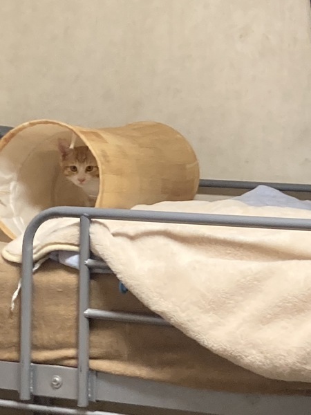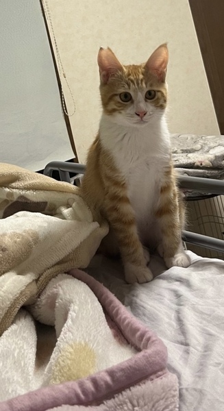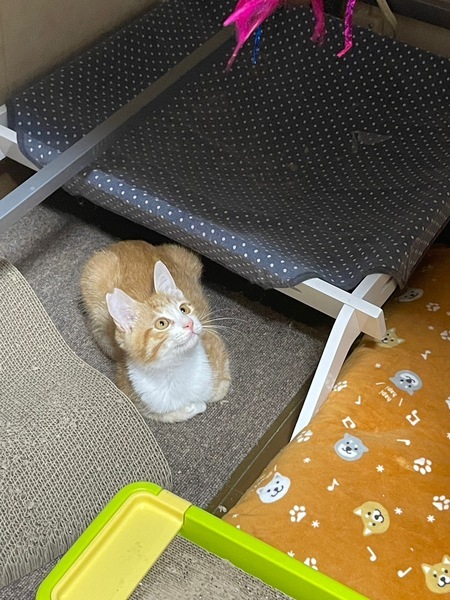 | 特徴(性格など) | 茶白のとても愛らしくて可愛い男の子です。まだびっくりすると隠れてしまったりもしますが、トンネル遊びやジャラシが大好きで元気いっぱいです。ご飯もよく食べ指からちゅーるを食べることもできます! エイズウイルス検査…陰性 白血病ウイルス検査…陰性 ワクチン接種…済み 去勢手術…済み ノミ、ダニ駆除済み 糞便検査済み |