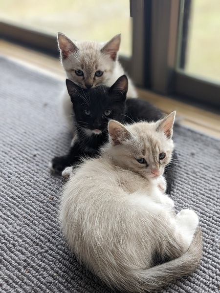 | 特徴(性格など) | 黒に白が混じった子がメスで白に近いグレーの子たちはオスです。 生まれた日から世話をしているので人慣れしています。とても大人しいです。 白い子の1匹が後ろ足の左足の指が3本だけありません。うちの猫が舐め過ぎて指が取れてしまったと思われます。特に歩行に支障もなく元気です。 |