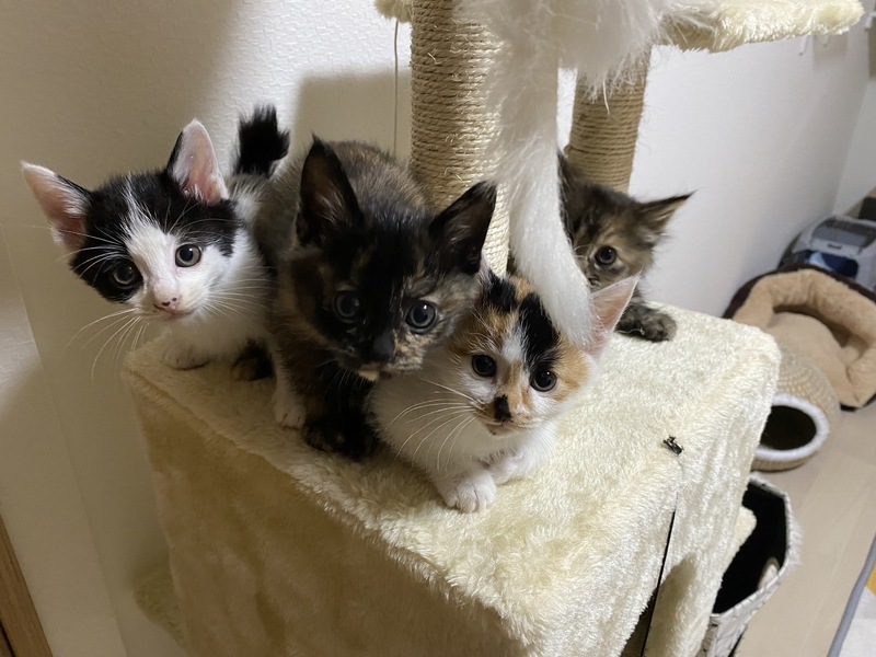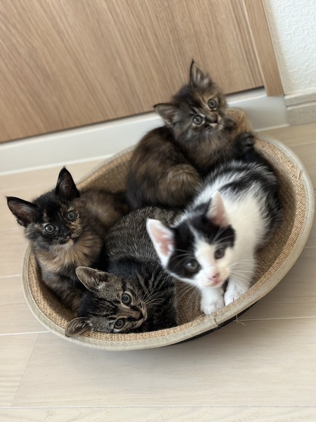 | 里親募集する理由 | 知人の家を訪問して、表で話をしていたら、向かいの空き地から子猫がゾロゾロ出てきたので、慌てて保護しました。どうやら空き家で母猫が子育てしていたようです。 | ||