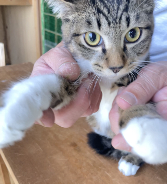 | 特徴(性格など) | ちょっとビビりで繊細ですが、ナデナデ抱っこもできます。 足の先が白く短いソックスを履いてます。 シッポは幸せを掴む鍵シッポ♡ まだ住職以外の人への馴れは100%ではありませんが、ナデナデ抱っこができるので、一緒に暮らしていくうちにすぐにスリスリする様になり新しい環境と人にも慣れてくれる子だと思います。 |