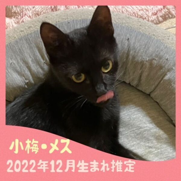 | 特徴(性格など) | 【仮名】小梅 【性格】すぐにゴロンとお腹を出してとても甘えん坊です。 全身真っ黒、とても長いしっぽを持っています。 【健康状態】良好です トイレもきちんと出来ます。 ご飯大好きの健康優良児です。 |