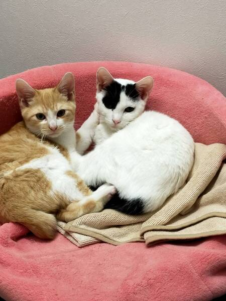 | 特徴(性格など) | 外では軒下やガレージで寝て、置いてあるエサを食べていた 保護した当初は下痢、投薬で現在は治っている 穏やかで大人しめの性質 控えめながら膝の上に乗って甘えてくるようになる 保護猫同士でに寄り添ってお昼寝している |