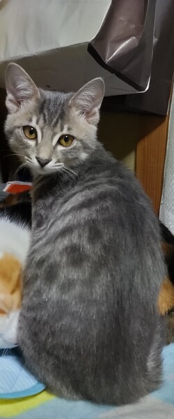 | 特徴(性格など) | キジ、グレー(オス)好奇心旺盛でやんちゃ、膝に乗って甘えます まっすぐ長いしっぽです。 生後5ヶ月程で元気に遊ぶのが大好きです。 ご飯はキャットフードと缶詰を混ぜたのをよく食べます。ミルクは卒乳してます。 トイレのしつけはできています。 |
