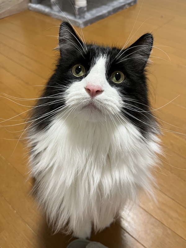 | 特徴(性格など) | ノルウェージャンフォレストキャットの黒白ハチワレ 体重7キロの大きい猫ちゃん かまってちゃん 甘えん坊 遊び盛り ※何にでも口に入れてしまうので注意 |