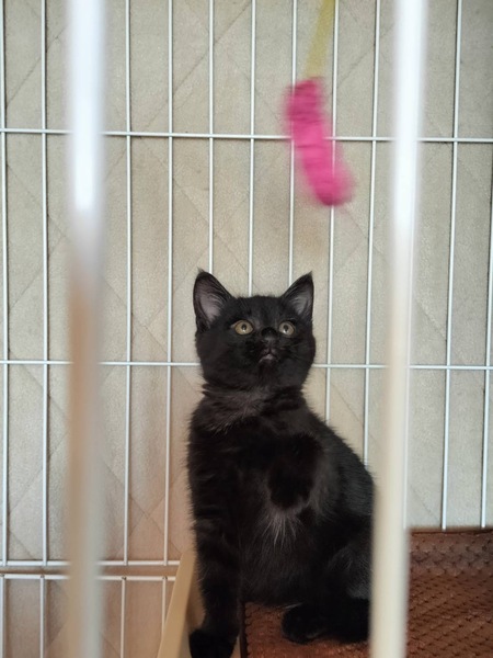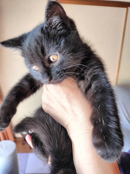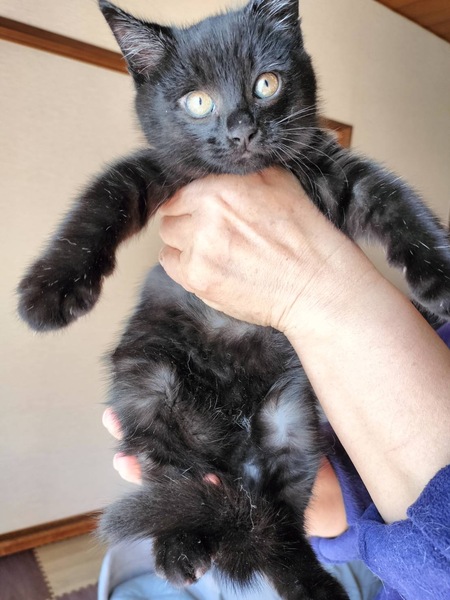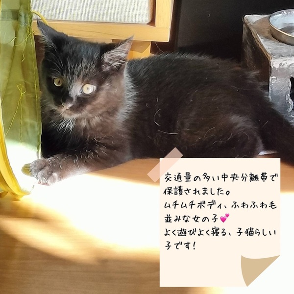 | 特徴(性格など) | 黒猫少し長毛、モフモフムチムチな とてもかわいい女の子です! 子猫らしくよく遊びよく寝る元気な子! 人にもよく慣れています。 |