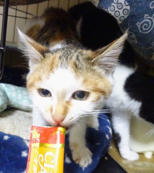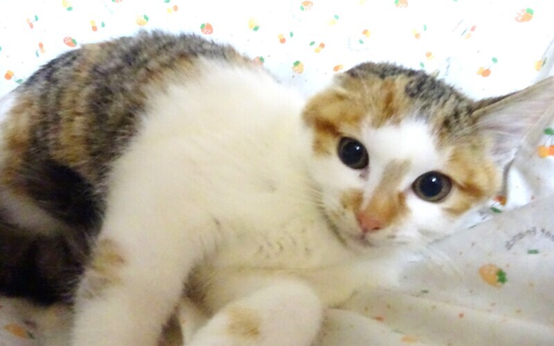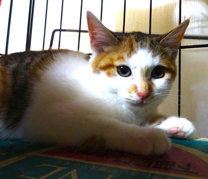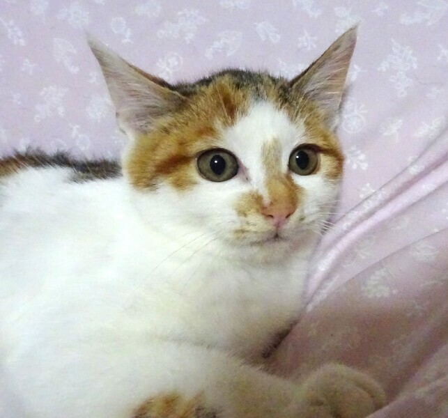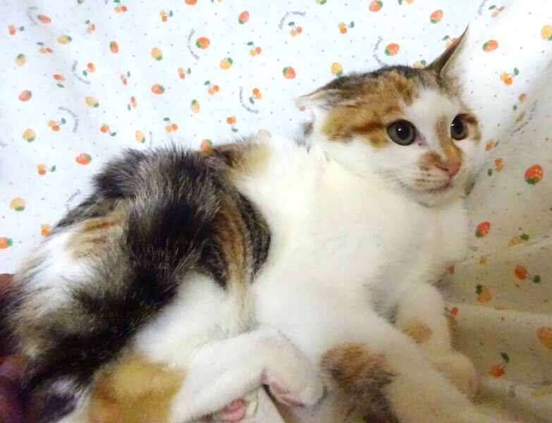 | 特徴(性格など) | 仮名: ミーシャちゃん(メス) 毛色: 淡い三毛 性格: 保護して間もないので個性ははっきりしませんが、4匹兄妹全員がビビりで、最初はシャーと威嚇して、引きこもっていました。 少しづつ慣れ、今は威嚇なく触ったり抱っこしたり出来ますが、抱っこすると緊張しています。 ゆっくりと馴らしてくださるご家庭を希望しています。 兄弟は仲良くしていますが、多数の子猫がいると怖いようで、一緒に遊んだりするより探検したり隠れたりしています。 じゃらしにも反応しますが、まだ大人しく、積極的に遊ぶ感じではありません。 ちゅーるは好きなので、ちゅーるの時に抱っこしたりしています。 兄弟のサンダーくんと一緒だと良いですが、別々でも構いません。 留守番は出来ますが、なるべく留守番時間が短めのお家を希望します。 お届けは千葉県のみで車で1時間圏内でお願い致します。 検便済 駆虫済 3種混合ワクチン済 猫エイズ・白血病ウィルス検査はともに陰性です |