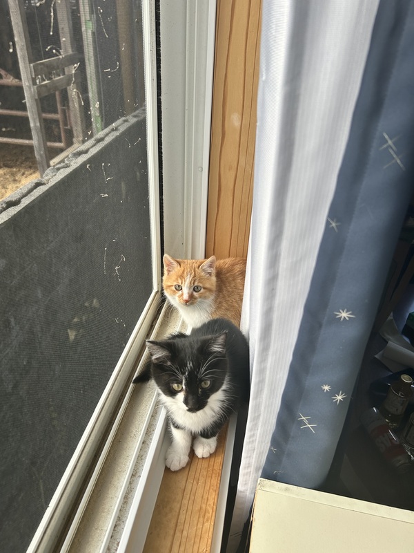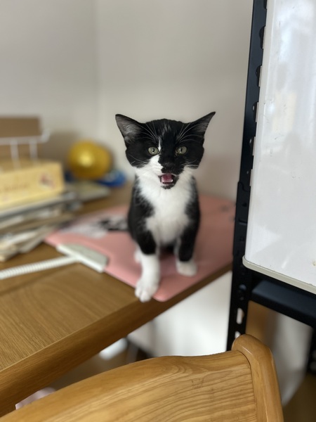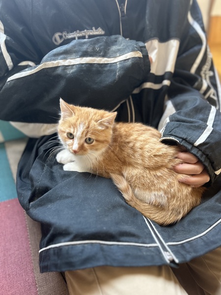 | 特徴(性格など) | 2週間ほど前に母猫から離して保護しました。オスの白黒は人が好きになってくれたように感じます。ともかくよく遊びます。 茶トラのメスは逃げることはあまりありませんが、自ら寄って来ません。でも、一度膝の上に乗せるとゴロゴロ言って離れません。時間が経てばもっと人に懐くと思います。 |