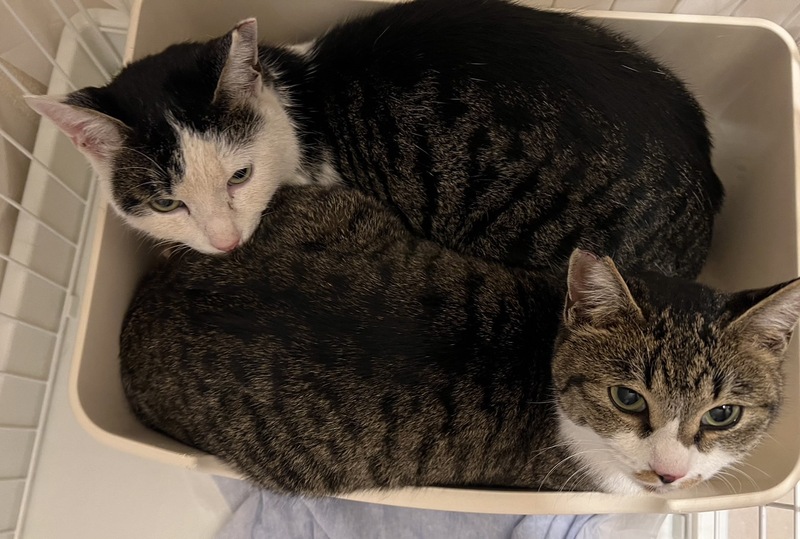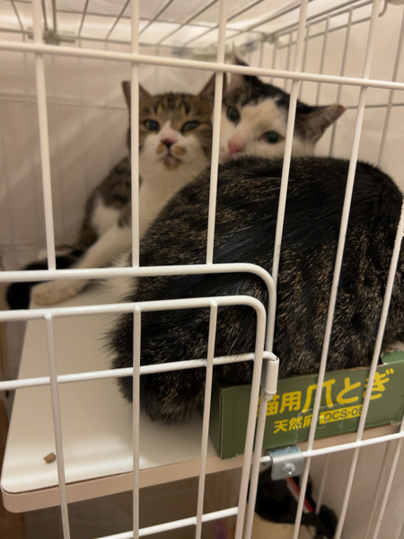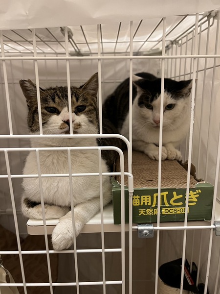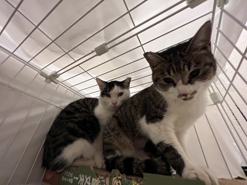 | 特徴(性格など) | ◆性格や特徴 サバちゃん 顔のグレーの部分が多い方 年齢 推定2歳 2024/11/21保護、去勢 メス たぶん2~3kgくらい 病院には違う人が連れて行ったので、計測できていません。 小柄な女の子 お風呂にも入れましたが、全く威嚇してくることもなく入れました。 保護して1.2日は夜泣きが凄かったですが、兄弟のはっちゃんと一緒にしてからだいぶ減りました。 今も夜泣きゼロでは無いですが、ほとんど収まっています。 トイレはまだ練習中です。 ———————————- はっちゃん 顔の白い部分が多い方 年齢 推定2歳 2024/11/23保護、去勢 オス たぶん4~5kgくらい 病院には違う人が連れて行ったので、計測できていません。 とにかく大人しく、ほとんど鳴きません。 お風呂に入れた時も、お利口さんでびっくりしました。 ◆健康状態 サバちゃん 顔のグレーの部分が多い方 猫エイズ(FIV):陰性 猫白血病(FeLV):陰性 去勢済み ノミ、ダニ駆除済み ワクチン未接種 ——————————— はっちゃん 顔の白い部分が多い方 猫エイズ(FIV):陰性 猫白血病(FeLV):陰性 去勢済み ワクチン未接種 ノミ、ダニ駆除済み |