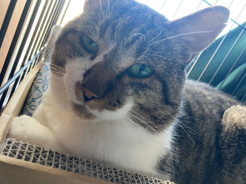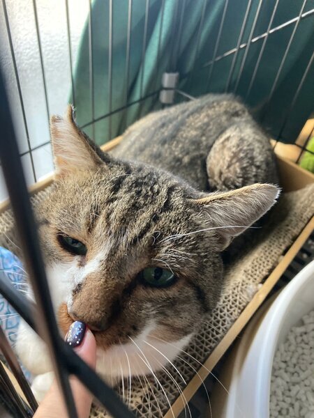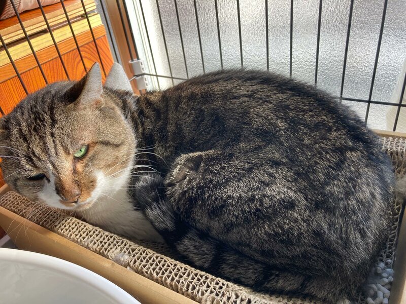 | 特徴(性格など) | 背中がキジトラ、おなかが白のキジシロです。 猫風邪の症状があり、涙焼けの跡があります。 マッサージされるのが大好きな甘えん坊さんです。かすれた鳴き声がチャームポイントです。 甘えたいときにおねだりが出来る賢い猫さんです。 頬から首にかけてゆったりとお肉があり、首は太く見えます。 おそらく元ボス猫ですが、最近は人間に「撫でろ~~~」「ごはん~~~」とわがままを言って甘えん坊の姿ばかりです。 |