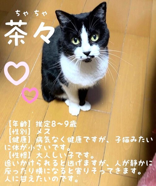 | 特徴(性格など) | 【仮名】茶々(ちゃちゃ) 【年齢】推定8歳 【性別】メス 【ワクチン】3種混合接種済み 【避妊手術】済み 【猫エイズ白血病】どちらも陰性 【性格】甘えっ子で人が大好き。静かな大人しい子です。 少し臆病なところがありますが、ゆったり静かに寄り添ってくれる子です。優しい飼い主さんとのずっとのお家を探しています。 |