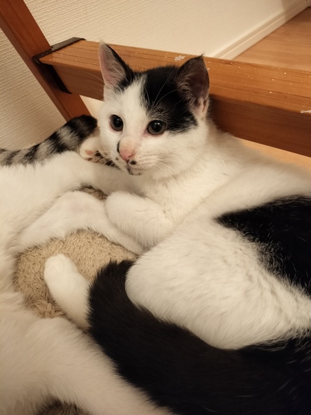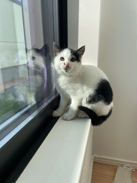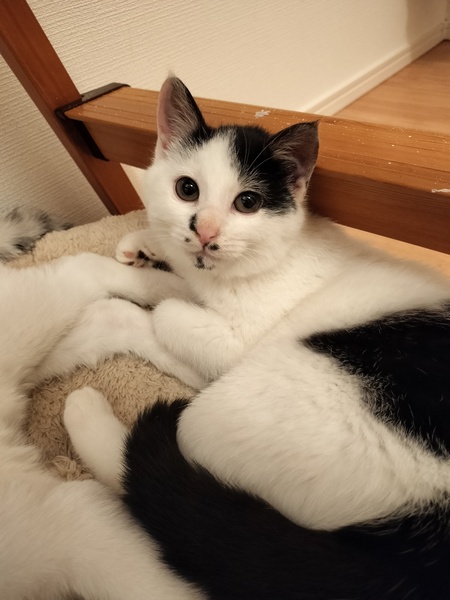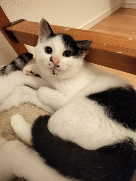 | 特徴(性格など) | 白が多めの白黒女の子✩.*˚ 毛質はモフモフでふわふわしているのと、ずんぐりむっくりな体型が特徴です! ◎エイズ白血病検査 陰性 ◎ノミダニ駆虫済 ◎ワクチン1回目接種済 男の子の兄弟と一緒に保護し、怖がりだった兄弟の代わりに気丈にシャーをしてみたり、でもどこか怖がりだったり、、最近シャーもだいぶ減り、たくさん触らせてくれるようになりました(*´`) 猫じゃらしなどのおもちゃが大好きで、ずんぐりむっくりしながらダッシュで追いかけています! 怖がりさんですが、遊びやちゅーるが大好きで、手からのちゅーるも大好きです。 ちゅーるはモウちゃんも手で奪いに来ます☆。.:*・゜ よく食べよく飲み良く出します☆ 我が家の猫とも交流があるので、先住さんがいるお家も前向きにご検討ください☆ |