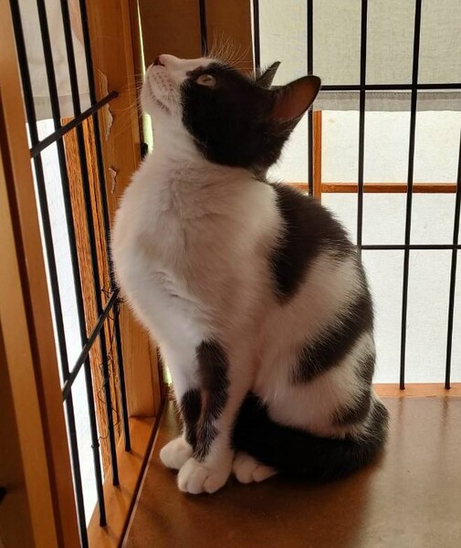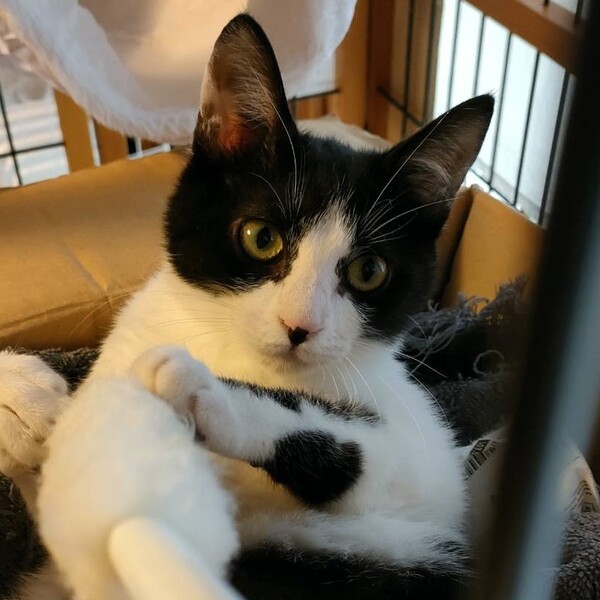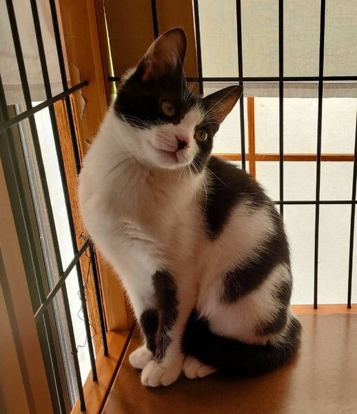 | 特徴(性格など) | 撫でられるのが大好きです。 保護された当初は警戒心がとても強かったのですがようやくリラックスして遊ぶようになりました。 へそ天でくつろいでいることも。 人がケージの横で何か食べていると、真似して口をモグモグします。 また話しかけるとよく返事をするようになりました。 おしゃべりな仔です。 近づくとシャーと言いますが、手は出ませんし、噛みつきもありません。 エイズ・白血病(-) 駆虫済み |