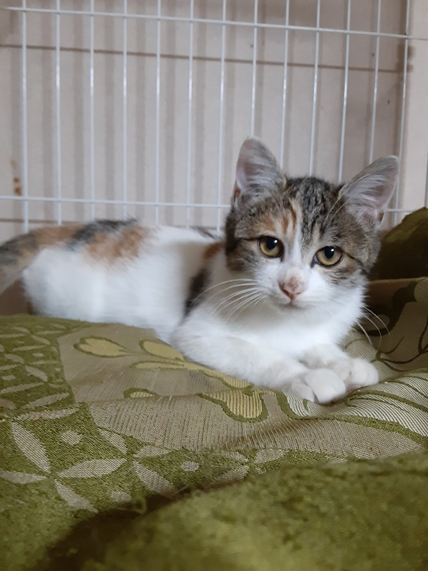 | 特徴(性格など) | 白が多めの可愛い三毛です。顔も丸顔で可愛いです。カリカリをよく食べます。トイレなども失敗しません | ||