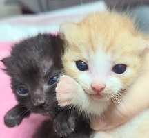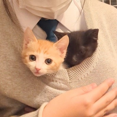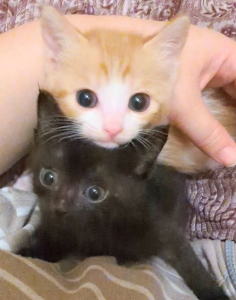 | 特徴(性格など) | 黒「モル」女の子、尻尾短め 保護時は75gしかなくぐったりとしていて、ミルクも拒絶し心配でしたが、無事に育ちました♪ 甘えん坊の寂しがりだけど、女の子らしくマイペースでお転婆な一面も^^ 茶白「テル」男の子、尻尾長 最初から粉ミルクをすぐ受け入れてくれましたが、下痢もあったりで落ち着くまでは大変でした。 でも男の子らしく体は大きく育ち、めちゃくちゃ甘えん坊のゴロゴロくんです^^ ちなみに、仮名は保護日10月23日の「今日は何の日?」記念日にちなんで。 (北米の科学者が祝うモルの日と、かつて電気通信省が制定した電信電話記念日から) ウイルス検査陰性・ワクチン・駆虫・検便・マイクロチップ済み 2匹共、生まれてすぐの保護だったので風邪もひいておらず、最初の下痢などが落ち着いてからは健康そのもので、体重も一度も停滞する事なくぐんぐん大きくなりました。 現在は、カリカリと離乳食2:1位であげています。 |