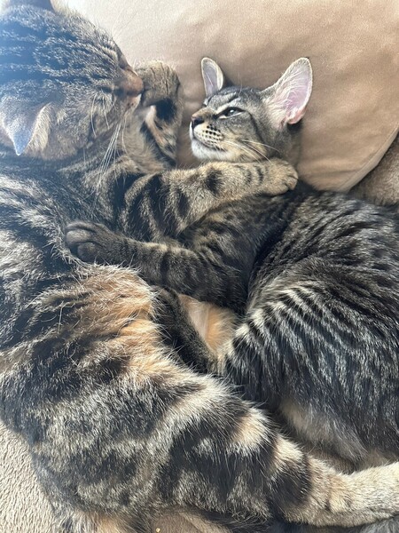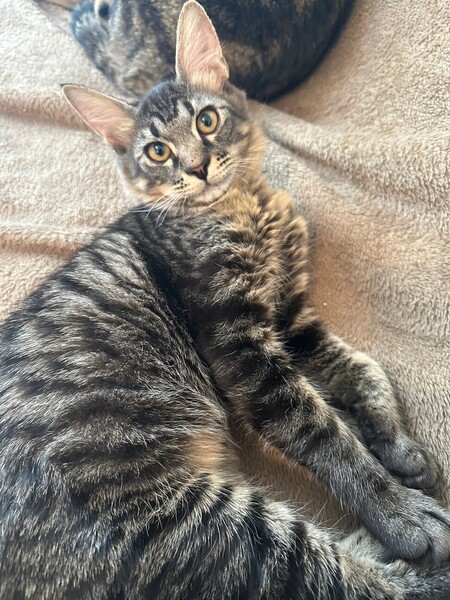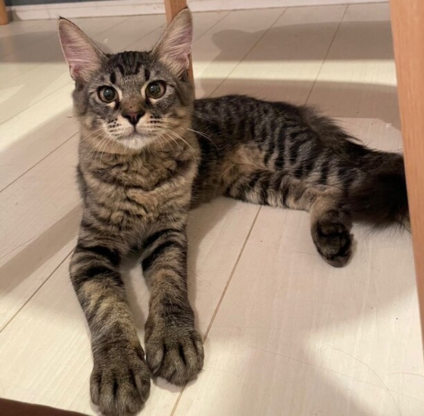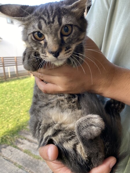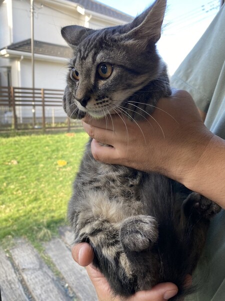 | 特徴(性格など) | 体調が整うのに時間がかかってしまいましたが、 今ではしっかりお肉が付き、毛並もつやつや。 シャーと言う割には容易に抱っこをさせ、抱っこをした途端にゴロゴロ喉を鳴らす究極のツンデレくん。 完全な短毛ではなく尻尾だけふわっと長毛。 びっくりしたときなどはその特徴的な尻尾がたぬきのようにブワッと太くなります。 お部屋の中を縦横無尽に駆け回る割にすぐ疲れてしまって 伸びてゴロゴロするかわいいやつ。 預かりボランティア宅の先住のお兄さん猫たちにいきなり甘えまくり子分気質全開。 ベタベタスリスリとお兄さんに寄り添って眠っています。 先住猫さんの性格にもよりますが多頭飼育向きの性格だと思います。 |