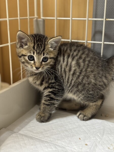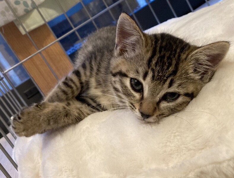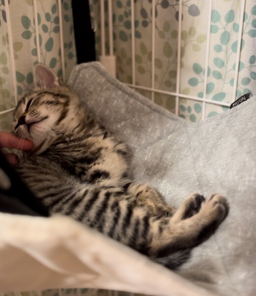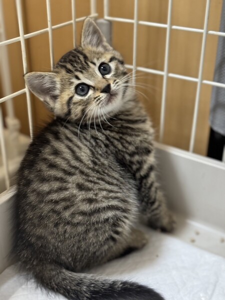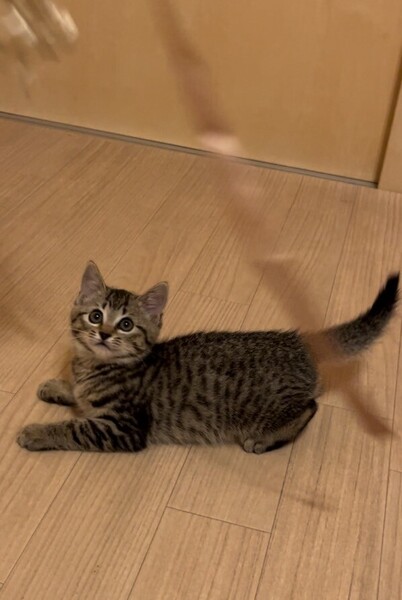 | 特徴(性格など) | 保護当時こそ、いっちょ前にシャーとか言っていたくせに、 あっという間にゴロゴロふみふみ遊び猫に返信しました。 運動神経はよく、かなり小さい時からケージの上の段までスパイダーマンのようによじ登り、 ご飯ともなるとかなりの高さからご飯皿めがけてダイブしてくる豪胆な娘さん。 非常に可愛らしく 非常に愉快な女の子です。 ヒョウを思わせるしなやかな体と、 ヒョウのような珍しいスポットのようなタビー(トラ)が実に美しいです。 |