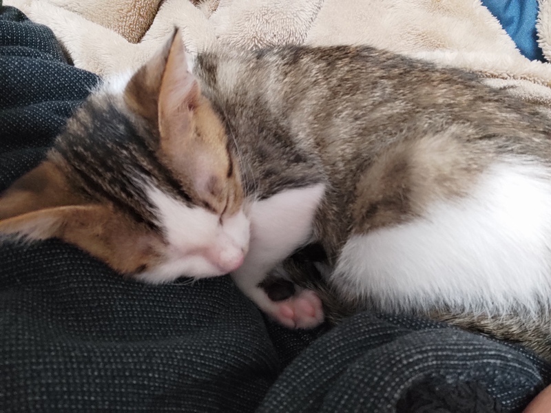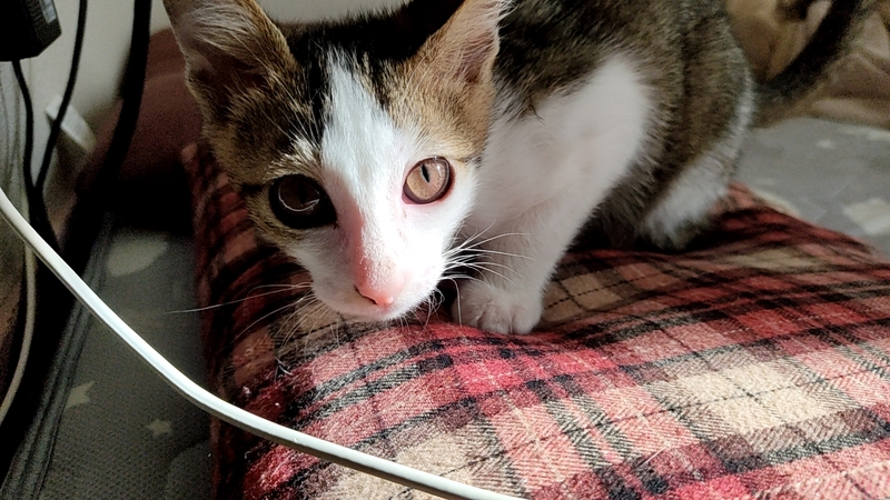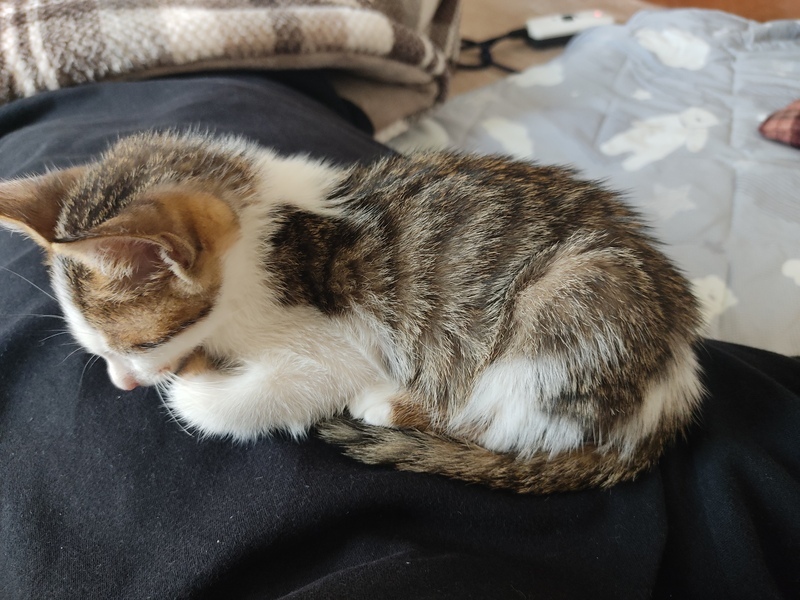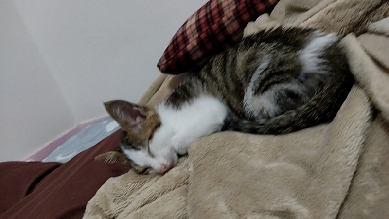 | 特徴(性格など) | 体力のある甘えん坊です。 甘えるときは顔や手に擦り寄ってきて、なでなで要求をしてきます。 グルグル喉を鳴らしながらふみふみしてくれたり、手を舐めたりと人懐っこいです。 抱っこしても比較的大人しくしてます。寝ている時に布団に入ってきて添い寝もしてくれたりもします。 遊ぶときは、おもちゃを使ってあげると10分以上は走り回るほど元気です。 今はまだ子猫なので、色々気になって遊んだり、部屋中を駆け回ったりしています。 |