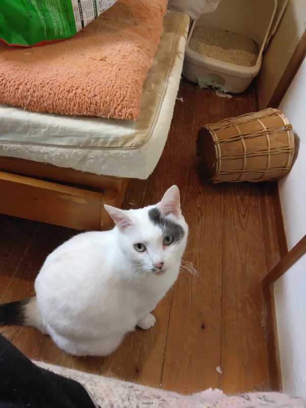 | 特徴(性格など) | 猫ちゃんの特徴ですが 色は、白猫ですが、ワンポイント黒いぶちがあり、これがまた可愛らしいです。 メスで5歳(2018年に救助したのですが、ペット医療センターの先生の推定では2018年5月生まれです) 避妊手術済みで、予防接種もしています。 高槻の震災の時に、雨に濡れぐったりした赤ちゃん猫でしたが救いました。 ペット病院にかかり、風邪も治してもらい、外には出せないので ずっと家の中で飼っていました。 今も外には出しておらず、室内の環境で育っています。 (外での放し飼いは無理です。猫社会のことは全く経験ありません) 鳴き声は上品で小さいのですが、これは最初からの性格のようで、 ご機嫌な時も、何かを話しかける時も、小さな声で、「シャイな女の子」という感じです。 また、とても人なつっこく、「おいで」と言ったら私の膝や肩の上に乗ってくれます。 私と家内以外は人とは会っていませんが、予防接種などでペット病院に連れて行った時も、看護師さんになついていたので、人を怖がっていないと思います。 ドライフードで育てており(「ネコ元気」ですが、特にこだわりはなく食べてくれます)よく食べてくれて、体格や毛並みもしっかりしています。 病気もせず、5年間元気に育っています。 トイレは、砂タイプの市販のものを使っており、お行儀もいいです。 |